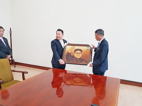 Ông Hồ Phước An (Tổng giám đốc GSC) tặng tranh gạo (chân dung nhà lãnh đạo Kim Jong Un) cho ông Pak Jong Hak (Cục trưởng Cục Châu Á 2) |